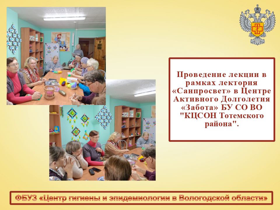 В рамках цикла лекций в просветительском проекте Лекторий "Санпросвет" главным врачом филиала ФБУЗ "Центр гигиены и эпидемиологии в Вологодской области" в г. Тотьма Коневой Ксенией Алексеевной проведена лекция с пожилыми людьми в Центре Активного Долголетия «Забота» БУ СО ВО "КЦСОН Тотемского района". Тема лекции «Профилактика гриппа и ОРВИ», она направлена на информирование населения о соблюдении правил здорового образа жизни, закаливании, вакцинации, методах неспецифической профилактики ОРВИ и гриппа. Ксения Алексеевна рассказала слушателям, как сохранить здоровье в осенне-зимний период и какие меры профилактики особенно важны для людей старшего возраста. Главный акцент был сделан на вакцинации против гриппа — самом эффективном способе защиты от осложнений и тяжёлого течения заболевания. Проект запускается в рамках реализации коммуникационной стратегии «Санпросвет», федерального проекта «Санитарный щит страны – безопасность для здоровья (предупреждение, выявление, реагирование)» и направлен на повышение грамотности в вопросах профилактики инфекционных заболеваний и формирования ответственного отношения к здоровью. |